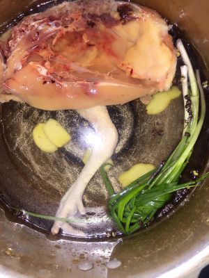 把鸡洗干净,葱打小结,姜片四块,花椒少量,放进锅里大火煮开(水要没过鸡)煮开后小火煮15分钟。