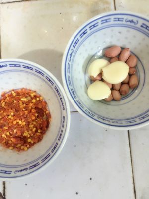 花生米小火放入锅里翻炒至花生皮爆裂,冷后切碎。