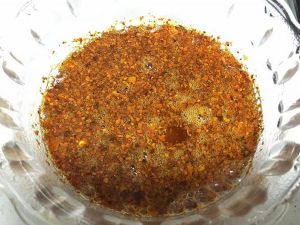 把油烧热后倒入干辣椒里,在油里倒入鸡汤,盐,生抽,酱油,香油搅拌。