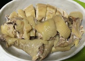 鸡煮好后捞起放入冰水里直到完全冰冷。