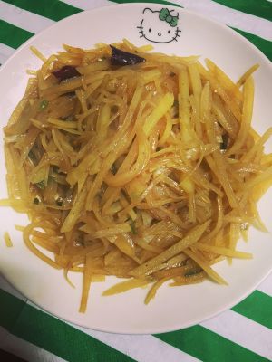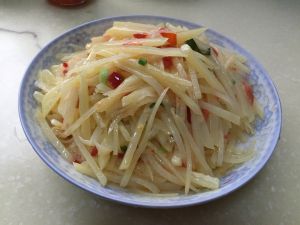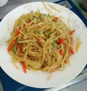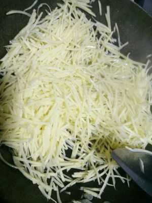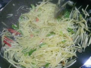 7,土豆丝捞出沥干水分,放入锅中,加入适量盐,大火快速翻炒。绿茶出锅时淋上少许白醋即可。