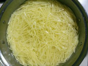土豆丝在凉水中静置5分钟,沉淀掉淀粉,在开水中焯一下。