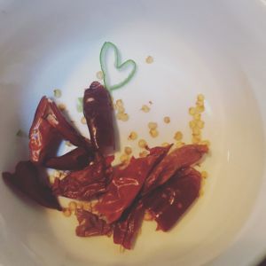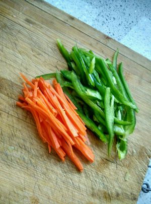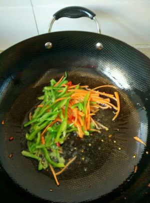 热油,放入干辣椒,花椒,青椒丝,胡萝卜丝翻炒