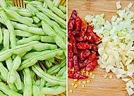 将四季豆洗净后择去两端的筋,然后掰成5-6厘米的段。大蒜和葱分别切成末,干辣椒剪成段备用。