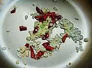锅中补少许油并用大火加热,放入干辣椒、葱末、蒜末一起炒出香味。