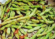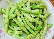 充分沥干四季豆表面的水分。用一小锅,将小锅烧热,倒入油大火加热,至油5成热时,放入四季豆,改成中火慢慢炸至表面变白,外皮开始出现皱褶时,沥油捞出。