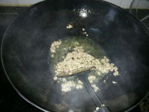 锅中放少许油,下入肉末炒熟,放入葱姜蒜红辣椒略炒
