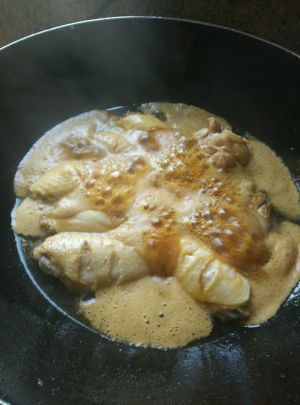 有香味时放鸡翅~把鸡翅抄到金黄色~加入可乐,可乐没过鸡翅,加入盐酱油,鸡精~