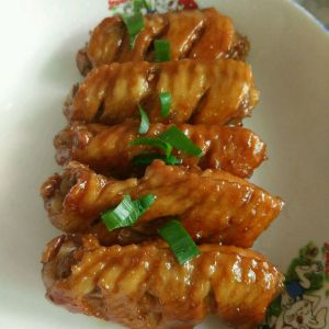 将鸡翅拿出来,摆好,再将锅里的汤料浇在鸡翅上,放好生菜即可完成啦。