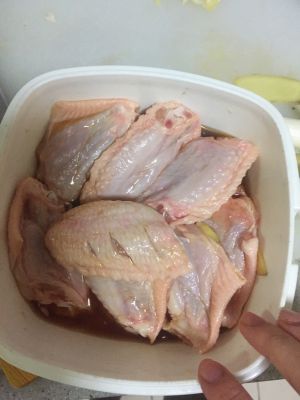 在鸡翅背部开三道,插一小片姜,倒入料酒,一点生抽,使用一点鸡精亦可,腌制十分钟去腥味。