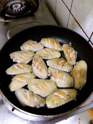 放油,等油热,煸葱蒜姜,然后加入鸡翅,翻炒至变色,然后加入可乐,盖住鸡翅,再加入酱油,看颜色而定。