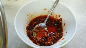 少许蒜泥,2勺炸好的辣椒油,2勺麻油,活均