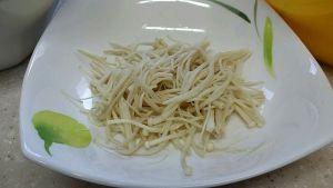少许金针菇,把尾部切除撕散,不要水洗,放在盘子里,放微波炉热一分种