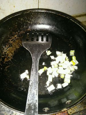 开火,洗好漓干的锅子倒油,待油温高点倒入切好的葱花,翻炒几下。
