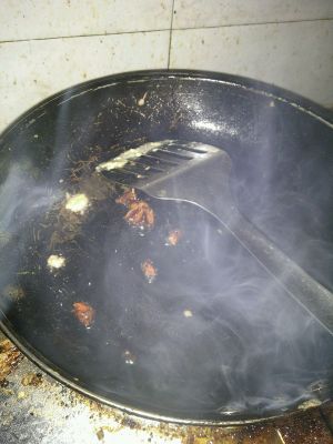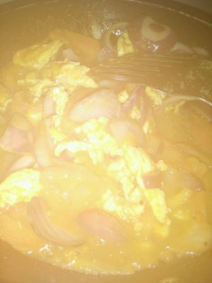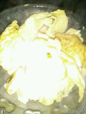 再把蛋液倒入锅内翻炒。翻炒整块后盛入碗中待用!