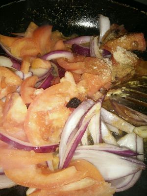 倒入西红柿,翻炒几下,加盐,调料,酱油一滴,大概翻炒两分钟。
