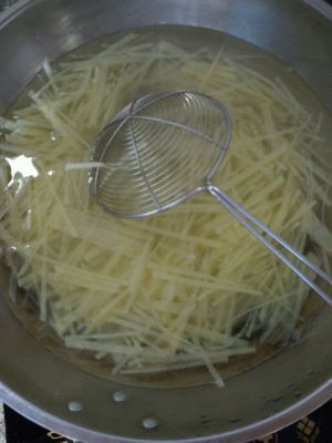 土豆切丝,泡水二十分钟,去淀粉,防止粘锅