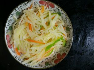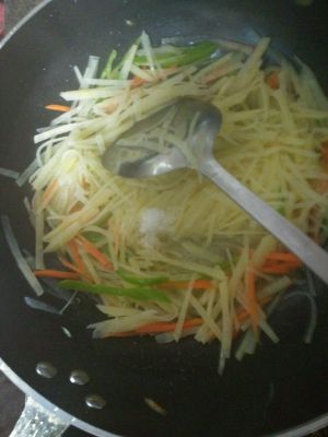 3,把食用油放进去,青椒,胡萝卜,炒一下,放土豆丝,调料全放进去,如果你喜欢吃酸甜的,可以适量放点白糖…~
