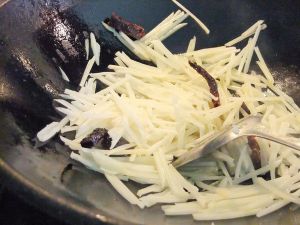 把火转大加入蒜片和土豆丝快速翻炒至土豆有点透明,
