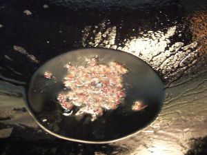 锅里热上2大勺的食油,加入花椒中火炸香取出丢弃,