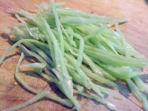 将土豆切丝后放烧开水的锅内煮3分钟(此时间段可以用锅铲翻动)然后倒出用冷水冲至冷却 晾干水。