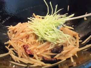 加入醋继续翻炒1-2分钟,然后加入酱油或盐调味。加入青椒丝翻炒至断生即可。