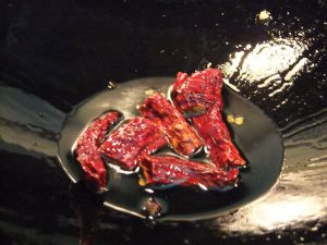 热油(油顺着锅边滴入,这样土豆丝不会粘锅)…当油微热时放干辣椒丝、葱、蒜炝锅翻炒… 不要翻炒太久