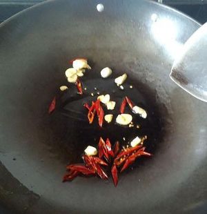 先烧热油锅,炸一下辣椒和蒜,出味道。