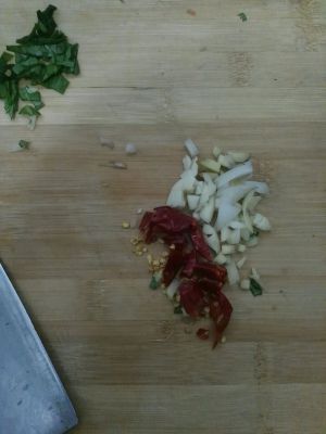辅料:蒜1头,1半切片,1半切末;小香葱1根切葱花。