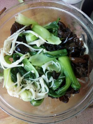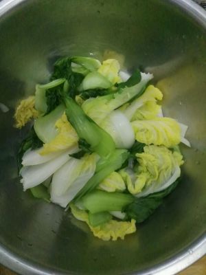 油菜,娃娃菜洗净水焯,放入盆中。有的人喜欢吃豆芽,也可以,我比较爱吃青菜。