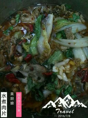 肉切片用淀粉,蛋清腌一下。放入油锅中,炒半成熟,捞出备用。油锅放入花椒葱姜蒜郫县豆瓣酱,加两碗水煮沸,再放入肉,煮沸。倒入盆中青菜上。