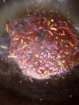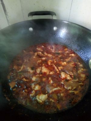 锅内放入底油。油热,放入适量花椒,葱,姜,祘,炒香,放入一勺豆瓣酱,适量,料酒,生抽,老抽,十三香,盐,鸡粉,糖,炒出红油!