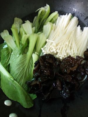 将剩余主料洗净放入开水中烫熟(香菇和胡萝卜烫久一点,青叶子菜最后烫),烫后放到碗中摆放好,烫过的水留用。