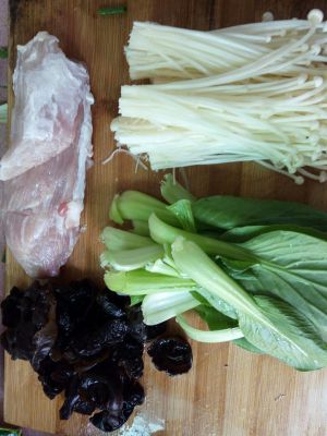 准备上海青,木耳,金针菇,净肉。洗干净,可以选自己喜欢吃的青菜,豆芽,红薯粉。