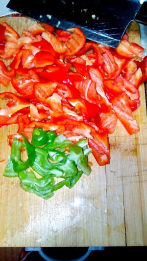 把辣椒切成块,我用的是青红椒混合,这个凭个人喜好,喜欢辣一点就用青杭椒,不喜欢辣就用薄皮椒