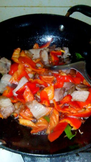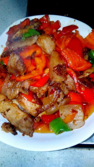 锅里放油爆炒葱姜蒜、放郫县酱豆瓣,放入尖椒片和五花肉片一起炒,加入少量甜面酱,少量生抽,白糖、鸡精提味儿装盘! 味道鲜美、辣度适中、五花肉香(⌒∇⌒)