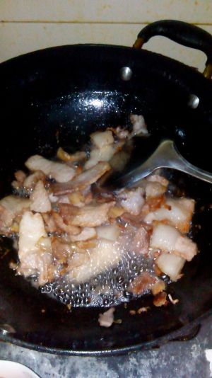 锅中到入油,油温稍微一热就把肉片倒入锅中(油温过高倒入油花会乱溅),小火多煸炒一会儿,把油脂炒出来,就不会很油腻