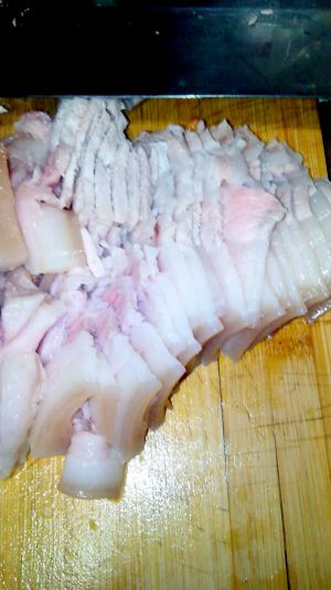 五花肉整块放进锅里煮至七八分熟,并切成薄片