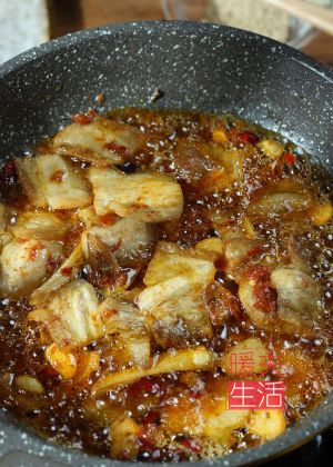 变色后加入郫县豆瓣酱翻炒,别加太多,豆瓣酱很咸