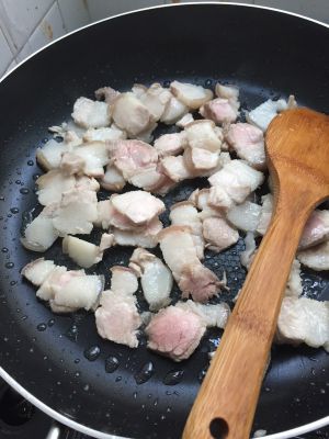 起油锅,大火,放入花椒、豆瓣后倒入五花肉,爆炒。
