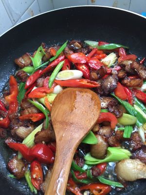 等炒到吧啦吧啦响的时候,依次放入红辣椒,菜辣椒,小尖椒,继续炒,再入葱进去,,,最后加入一点鸡精,一点胡椒粉,一点盐,翻炒几下,就可以出锅啦!