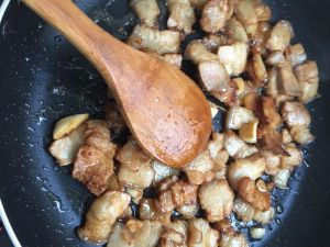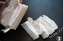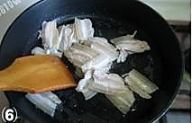 煮好的肉用凉水过一下,切成片,锅里坐油,下如五花肉片!