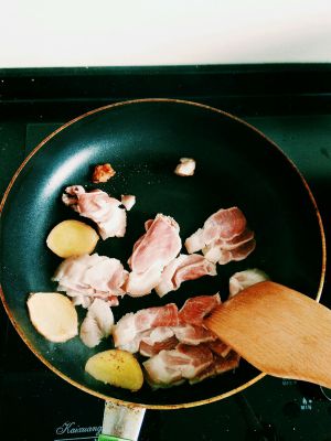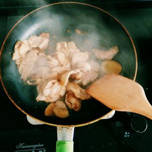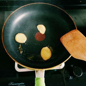 少量油,一定要少因为后来放肉会出油,把姜爆香