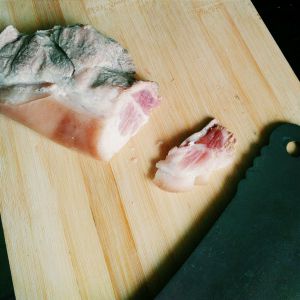 带皮五花肉处理要好,猪皮一起切炒更有嚼劲!起炉火,待铁锅烧热,将肉皮与铁锅按压接触,以铁锅代替烙铁烙糊猪皮!