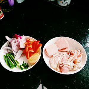 把洋葱彩椒都切成块,姜切三至四片,葱切成段,再取出少量切成葱花,火腿切片,肉切成薄片全部装盘备用