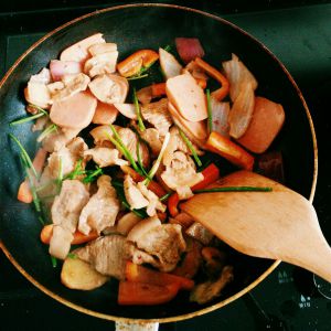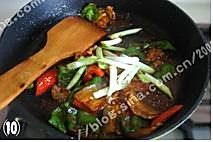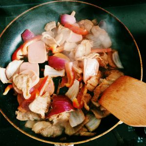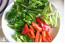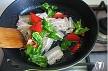 下7中的肉片及青、红椒块,翻炒均匀,喷少许料酒,加小勺白糖,翻炒至入味;