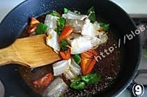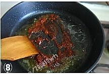 看看锅内余油,如较多则倒一部分出来做它用。下混合酱料(我个人习惯郫县豆瓣:甜面酱:蒜蓉香辣酱=1:1:0.5),煸至红油出,香味溢后,加入1中的原汤1大勺炒匀;