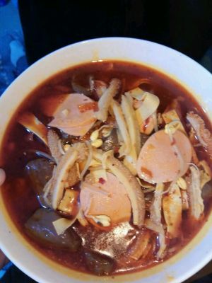 水烧开后放牛肚和鸭血一起煮几分钟,再放入豆皮和火腿,放盐 鸡精 再烧开就好啦。