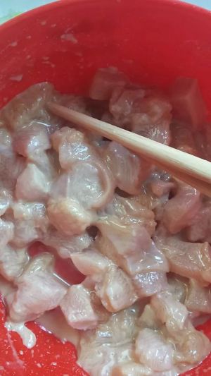鸡肉丁加盐,淀粉,料酒抓匀,腌10--20分钟。