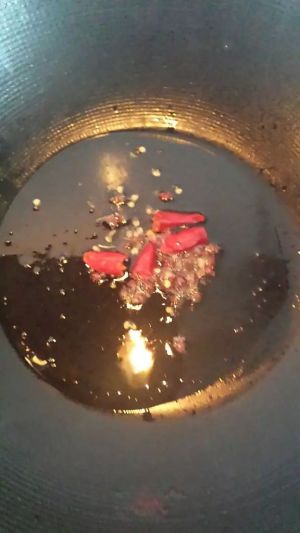 锅中倒入底油加热。依次放入姜、蒜,干辣椒、花椒,小葱煸出香味